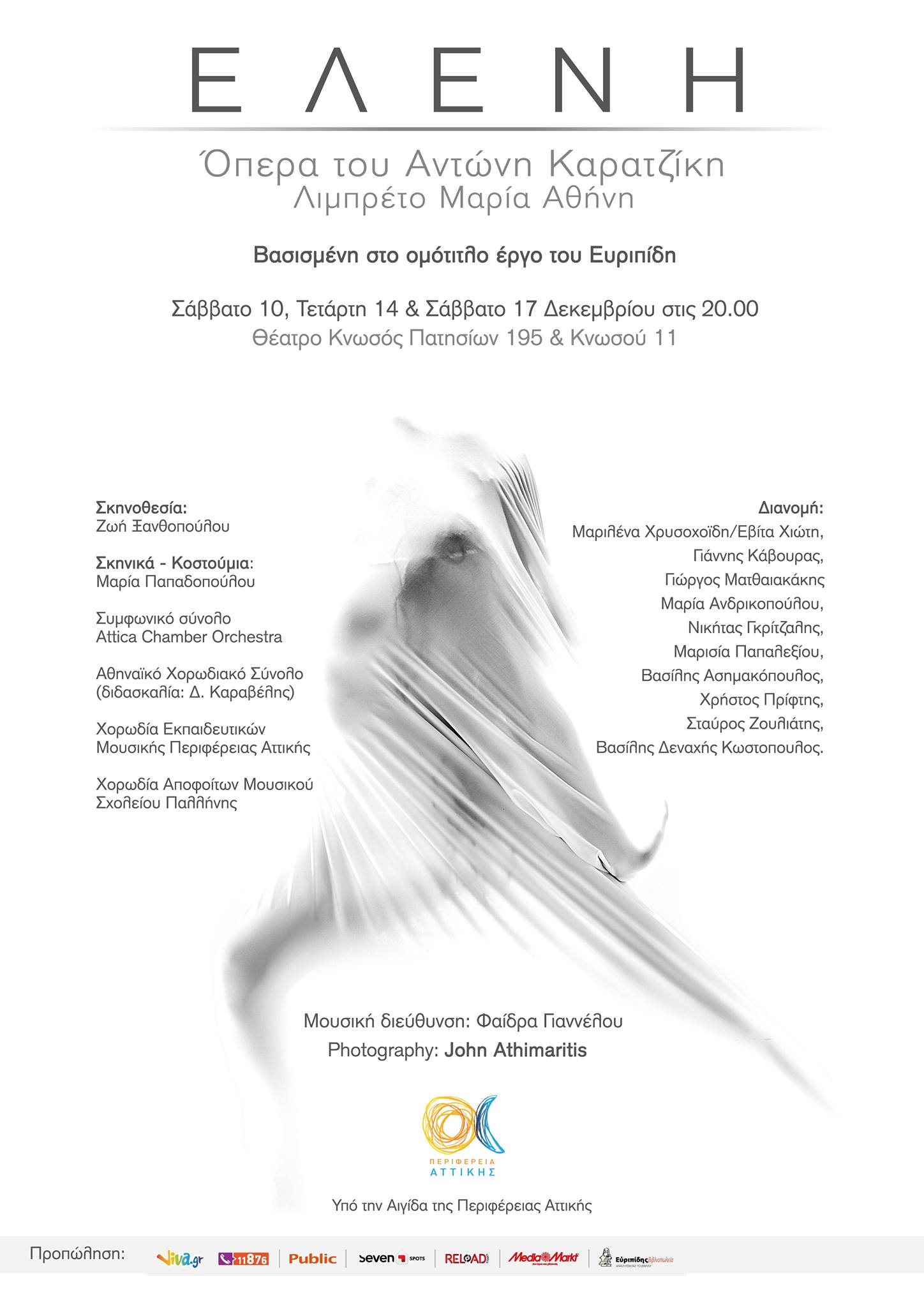 Θα θέλαμε να σας γνωστοποιήσουμε ότι στις 10,14 & 17  Δεκεμβρίου του 2016 στις 20.00 στο Θέατρο Κνωσός(Πατησίων 195& Κνωσού 11) θα ανέβει για πρώτη φορά η όπερα του Αντώνη Καρατζίκη «Ελένη»   Το λιμπρέτο είναι της Μαρίας Αθήνη και βασίζεται στο ομότιτλο έργο του Ευριπίδη. Την σκηνοθεσία έχει αναλάβει η Ζωή Ξανθοπούλου,σκηνικα-κοστούμια Μαρίας Παπαδοπούλου, σε μουσική διεύθυνση της Φαίδρας Γιαννέλου.